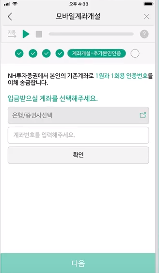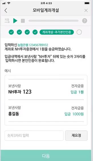 15. 어플에서 입력한 은행 계좌로 1원을 보낼 텐데, 보낸 사람 "NH투자" 뒤에 있는 번호 3자리 입력
