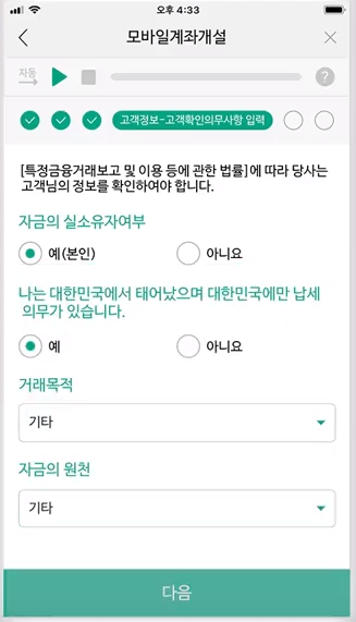 9. 고객정보 확인 하기! (거래 목적과 자금의 원천은 아무거나 해도 되지만, 편의를 위해 기타 클릭)